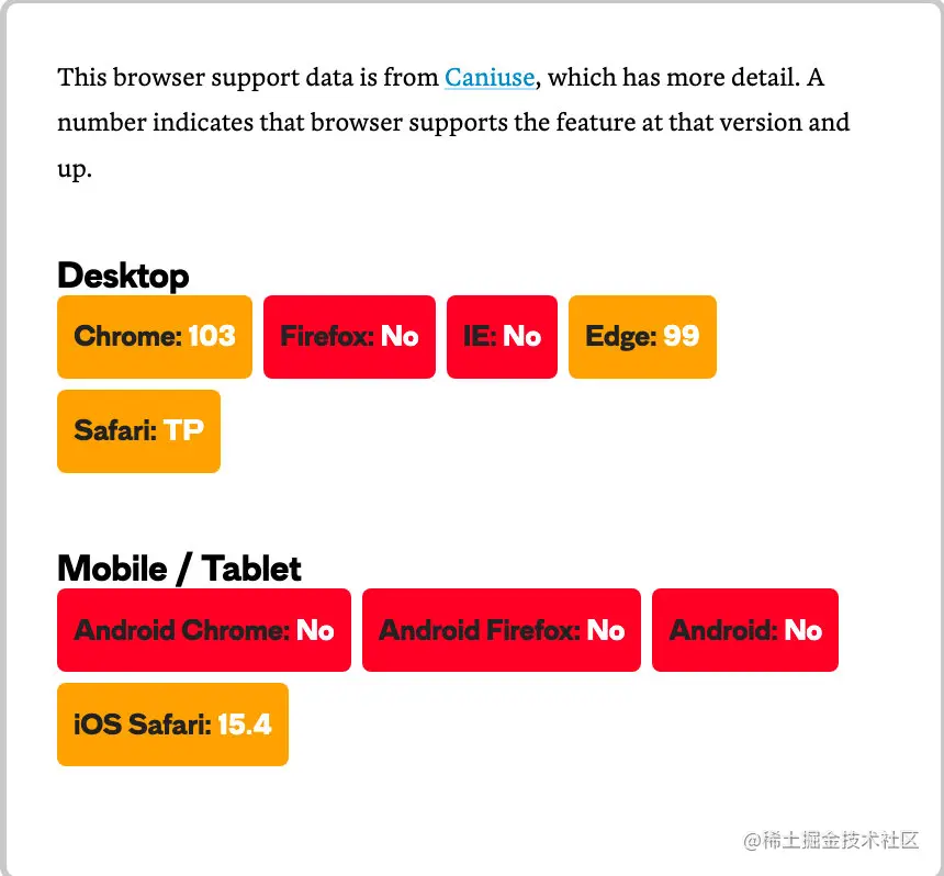 除了 chrome 103 ,其他部分浏览器的新版本也提供了支持,具体支持情况如下图。