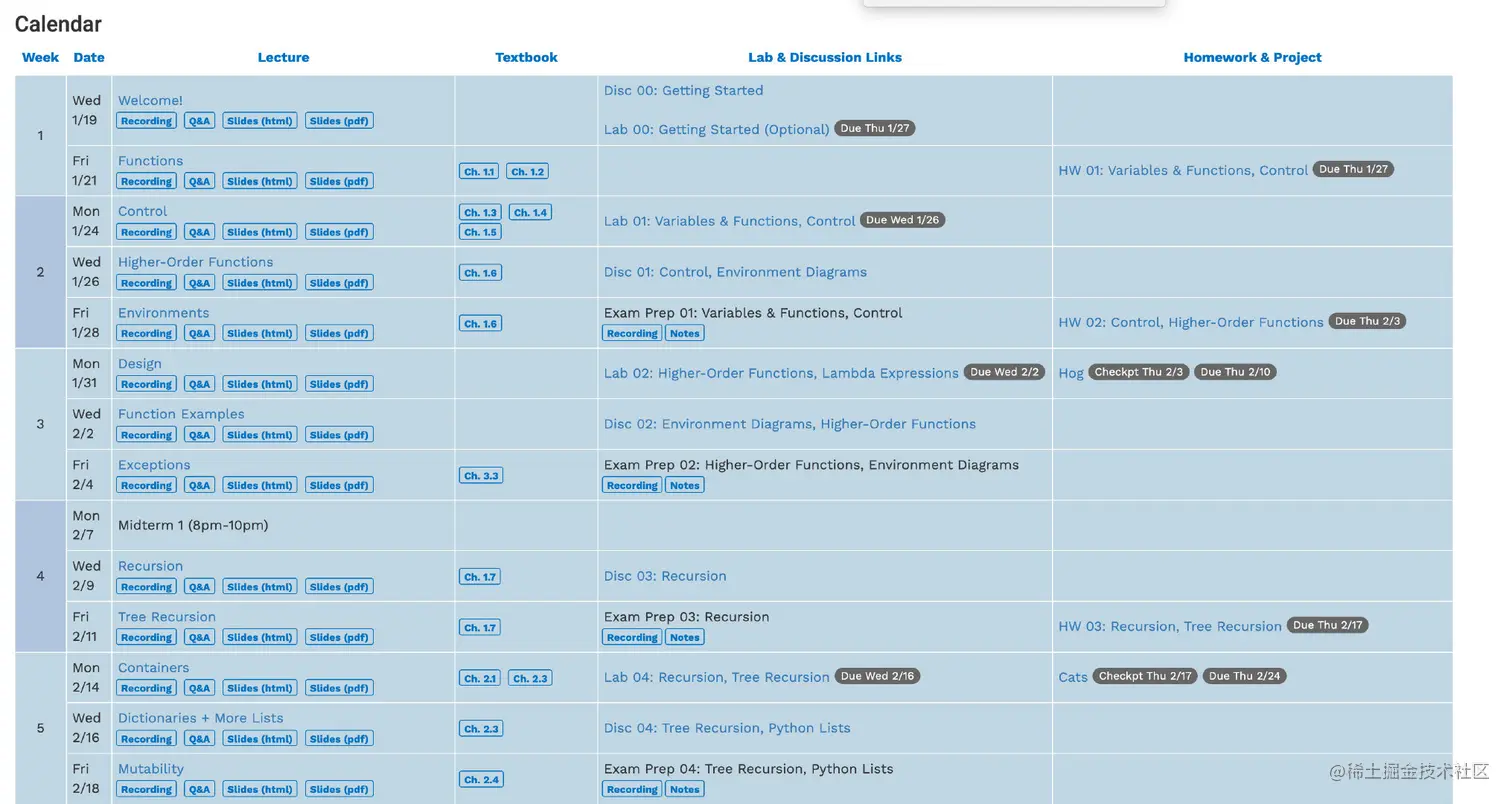 CS61A(Structure and Interpretation of Computer Programs)是伯克利所有计算机系学生必须要上的第一门编程课,前半部分以 Python 为主,后半部分以 Schema 为主。网站资源很丰富,作为一个普通游客最主要的就是课件,其提供了 html 和 pdf 两种格式。课件图文丰富,这和其他同级别课程差异很大,对新手比较友好。