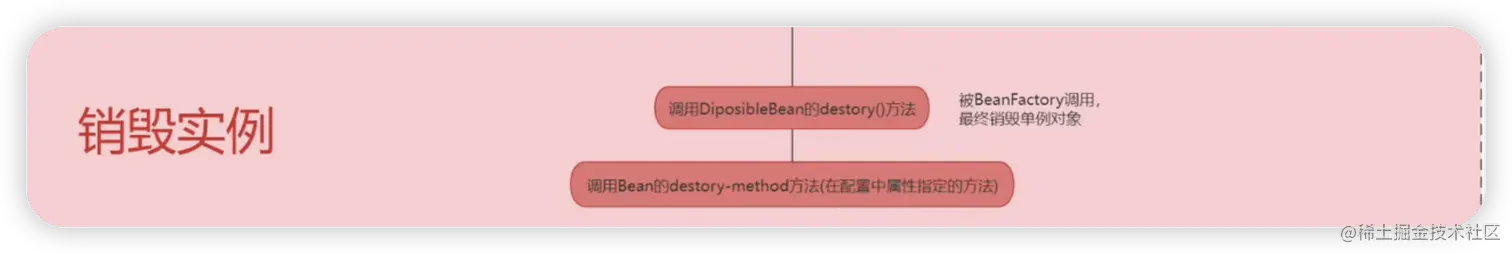 当Spring应用上下文被关闭的时候,上下文中的Bean都会被销毁,如果存在的某些Bean实现了DisposableBean的接口或者配置了上述所说的destory-method的一些方法,则会在这个阶段被调用。