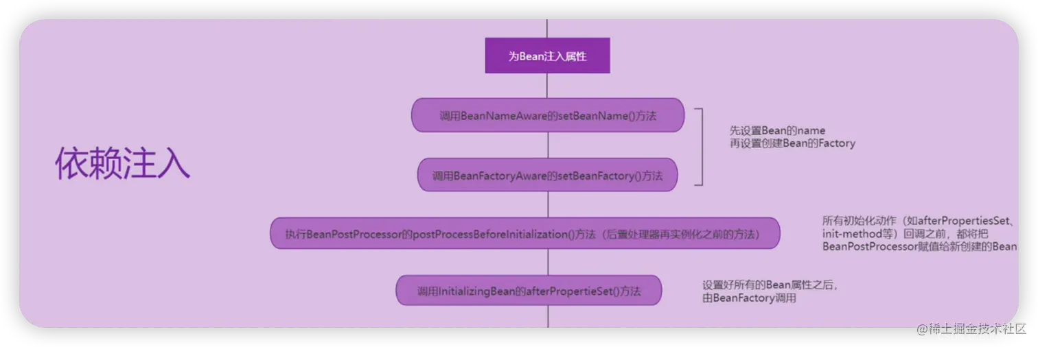 2、在这个阶段还会触发一些扩展的调用,比如说上述所说BeanFactoryPostProcessor在Bean创建之前就已经对中间件做好了处理实现,然而在依赖注入这个阶段,会触发BeanPostProcessors来回调BeanFactoryPostProcessor已经帮你实现的bean,