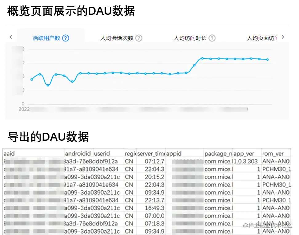 首先通过后台查询,某客户某天的DAU数据为252xxx,导出的数据中按UserID去重后的DAU为192xxx,占比76.3%,有23.7%的差距。