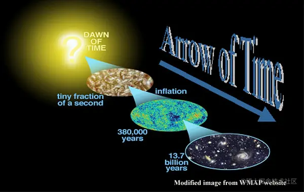 (上图中,经过130多亿年的膨胀,宇宙变得越来越无序了。)