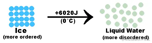 (上图中,冰块是分子的有序排列,吸收能量后,变成液体水,分子排列变得无序。)