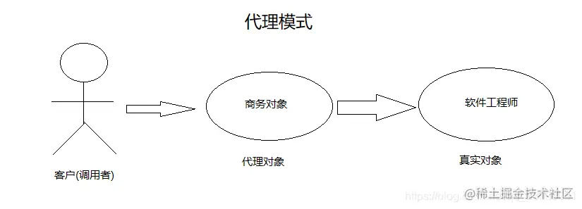 假设有这样一个场景,你的公司是一个软件公司,你是一位软件工程师,客户带着需求过来,显然不会先去直接找你,而是去找一个叫商务对象的人,此时商务就是代理你的人,同时也是与客户交谈的人。