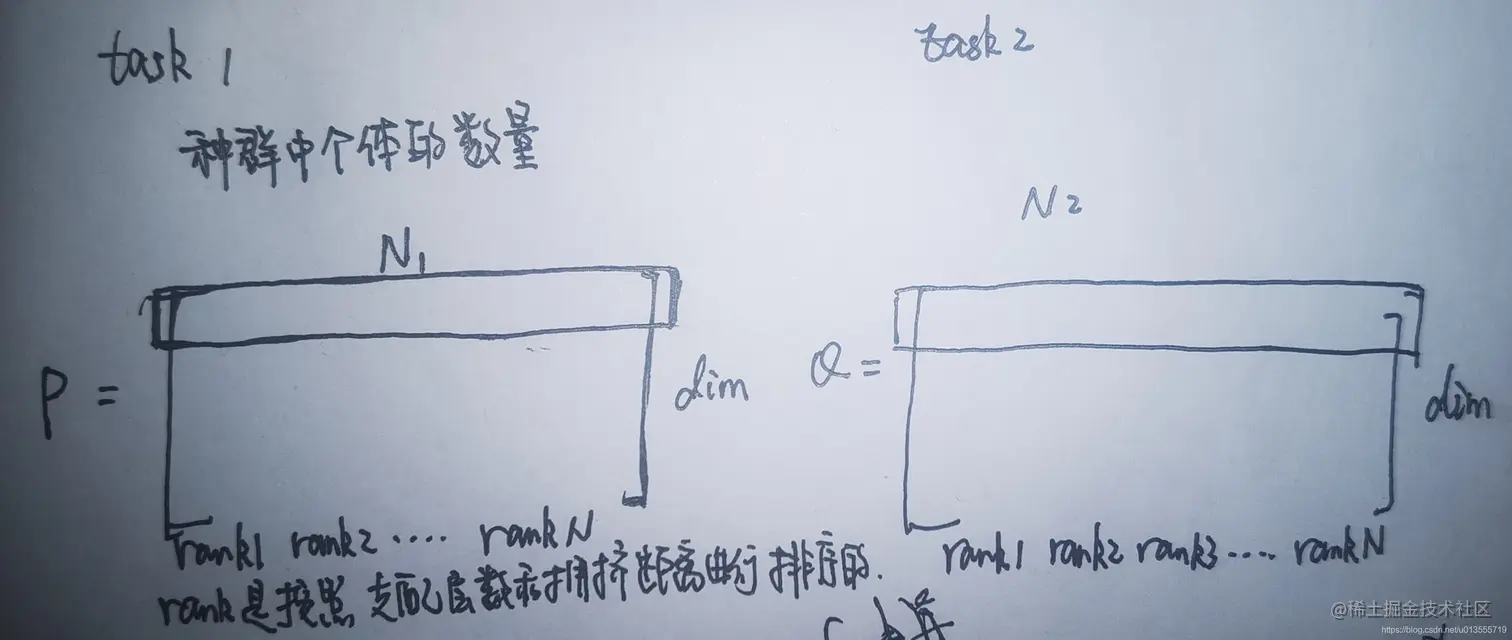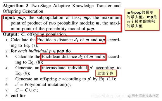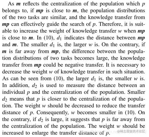 - 【自我理解~】,首先这个算法本身是为双任务环境准备的。对于每个任务来说,首先建立一个概率模型,记录最大点为m。 将两个任务的模型相乘,标记最大值为mp. 计算两者的欧氏距离d1. 遍历种群中的个体时,计算个体和自身任务的模型的最大点m之间的欧氏距离即为d2.--【这些都是在决策变量维度计算值在决策项链维度计算矩阵】