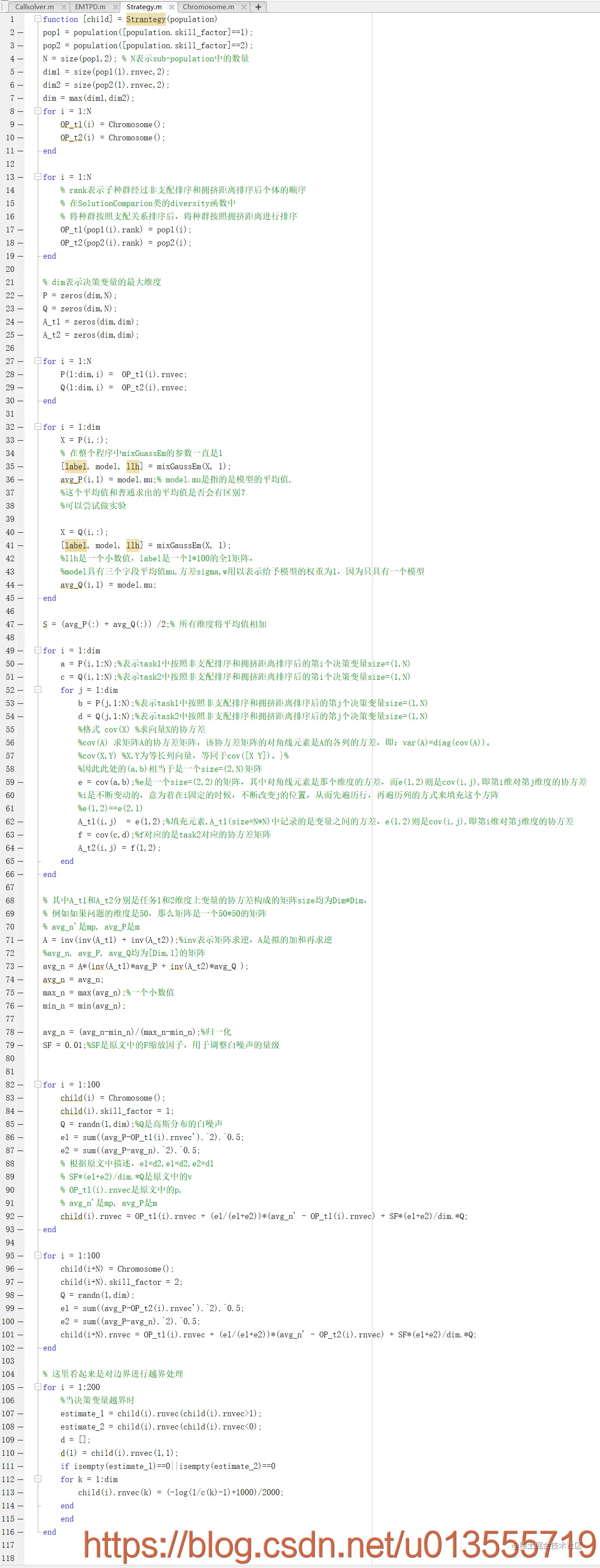 其中运行函数在Callsolver.m,算法的整体运行构成在EMTPD中,算法的主体和MOMFEA框架没有区别,最主要的区别在Strategy.m中。Strategy.m包含了整个模型的构建。其中极大似然函数,混合高斯模型,EM算法的描述遵循机器学习经典书籍PRML中的实现。
