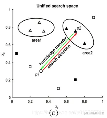 - 对于低相似性问题,任务1和任务2的总体分布非常不同[55]。对于KTS和KTM来说,不同任务的人群不适合互相引导去寻找一个理想的方向。这些任务之间很有可能发生负迁移。图1(c)示出了低相似度(LS)场景下的KTS的示例,其中不同任务的高质量解决方案分布在不同区域。这里,p1代表任务1的一个个体,p2是任务2的高质量解决方案。当知识从p2转移到p1时,p1会严重偏离任务1的高质量解决方案的收敛区域。