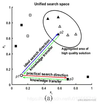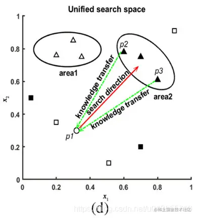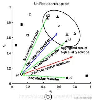 - 图1(b)示出了在HS场景下的KTM的例子,其中一个解决方案由另外两个解决方案指导。这里,p1是任务1的解。p2和p3分别是task2的两个高质量解决方案。p4是task2的劣解。如果知识从p2和p3转移到p1,p1可以被引导到高质量解决方案的集中区域。然而,KTM也可能会转移劣解P4–P1的知识。如果p1从p3和p4学习,它将偏离理想的搜索方向。在补充材料的图S1(c)中也提供了显示这种现象的代表性实例。相反,在一些KTS和KTM的方法[46],[53]中,每一代人对整个群体的搜索只受每次任务的一个或几个最佳解的指导。如果用于转移的所选解不是全局最优解,则很容易将种群引向局部最优解,如补充材料的图S1(f)所示。