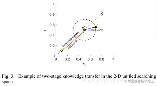 图3示出了两阶段知识转移的示例,其中p是从特定任务的群体中选择的个体,mp是概率模型的乘积的最大点。在知识转移的第一阶段,知识从mp转移到p。p的搜索由mp引导,中间个体p’就是在这个阶段产生的。第二阶段,中间个体p’的搜索范围再次被动态调整以产生后代c。