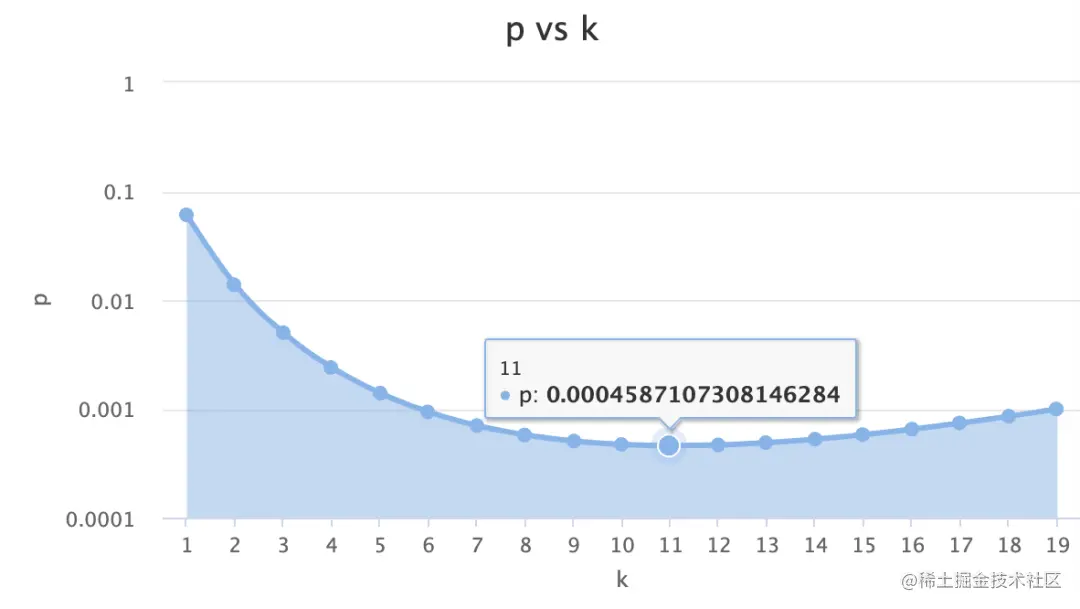 在设计Bloom Filter时,n和m我们可以根据实际计算场景提前确定,上述公式可以视为自变量为k,应变量为p的函数p(k),此函数通常在k > 0时通常不是单调的(由n:m确定)。因此Bloom Filter在设计时要考虑如何确定hash函数k的个数以获得最小的误判率p。根据上式可以计算得到当p为极小值时,对应k的值为: