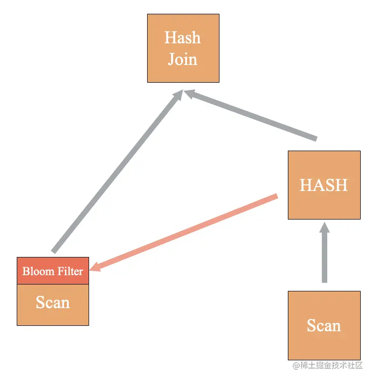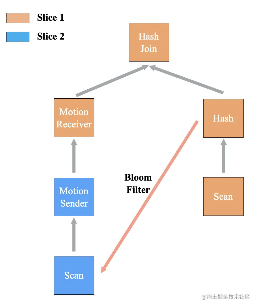 Local Join是指左右表的Join Key均满足相同Hash分布,无需再Shuffle数据。此时Hash、Hash Join和左表Scan处于同一个Slice内部,即同一个进程中,我们可以直接在进程空间内将Bloom Filter传递给左表Scan算子过滤输出。