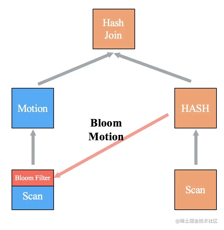 MPP Join存在的另一种情况是,左表Motion下不是简单的Scan,也没有关联信息将Join Key的Bloom Filter下推至Scan。那么以减少网络传输数据量为最后准则,将Bloom Filter过滤放在Motion前,减少Motion Sender的数据。