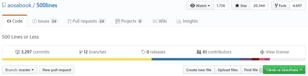 这本书在 GitHub 上的名称为 500lines,目前已经获得 20344 个 Star,4697 个Fork
