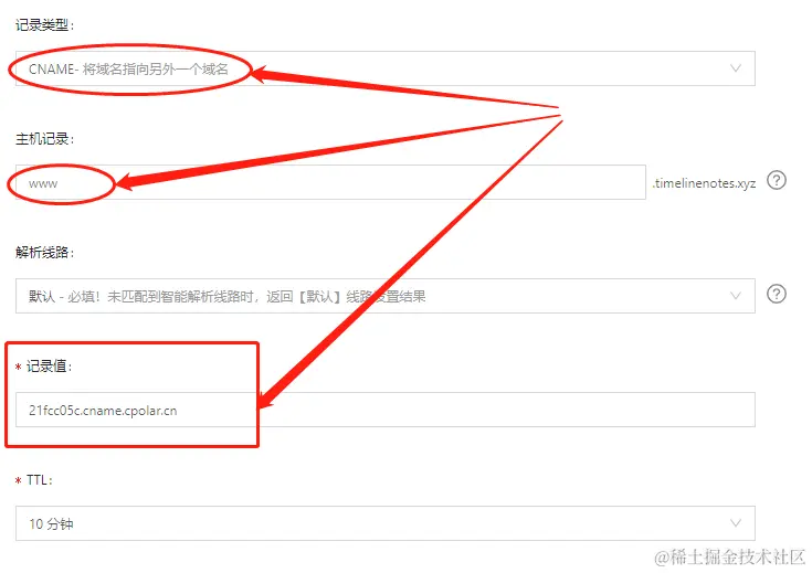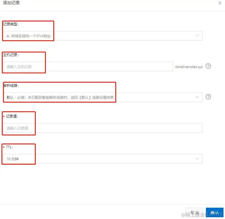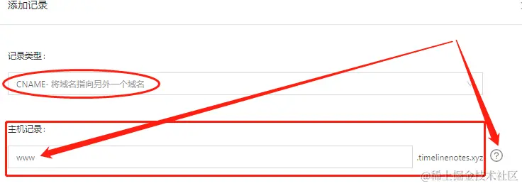 接着,在主机记录的空格中,我们填入“www”,与域名一起,就构成“www.timelinenotes.xyz”的完整域名。