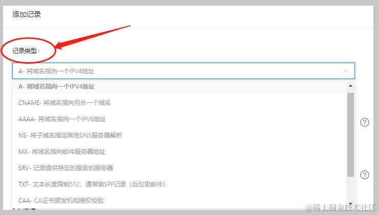 我们只需要在这些空格内,填入相关信息即可。首先第一项“记录类型”,我们点击空格处,在弹出的选项中,选择“CNAME”选项。