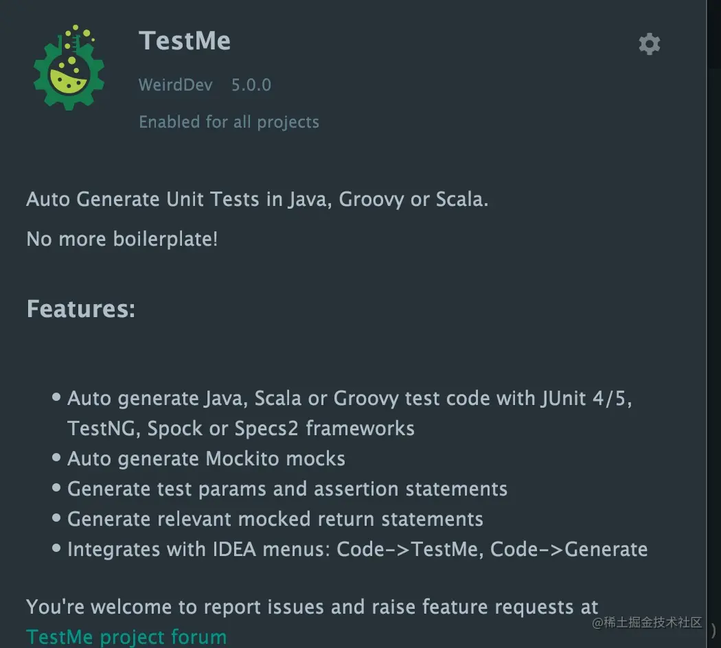 IDEA上有很多单元测试插件,能够半自动化生成单元测试类文件,这里重点推荐TestMe插件。TestMe插件可以智能分析被测试类的依赖类,结合Mockito+Junit等单元测试框架,生成Mock/InjectMocks依赖关系,自动生成单元测试类。
