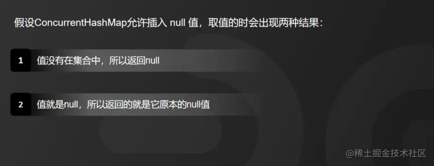 因为给ConcurrentHashMap中插入 null (空)值会存在歧义。我们可以假设ConcurrentHashMap允许插入 null(空) 值,那么,我们取值的时候会出现两种结果:
