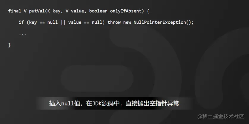 为了找到原因,我们先来看这样一段源码片段,打开ConcurrentHashMap的putVal()方法,源码中第一句就非常明确地做了判断,如果 Key 或者 Value 为 null(空) 值,就直接抛出空指针异常。