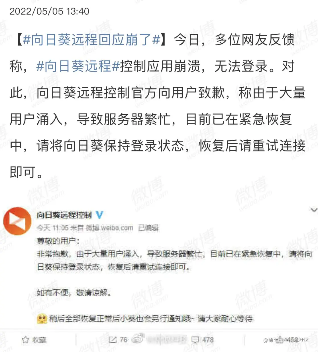 前段时间,我们公司使用的向日葵远程控制竟然崩了,导致无法登录,当时以为是公司网络出问题了,结果并妹有。后来就看到官方回应说,因为大量用户涌入导致服务器宕机了!