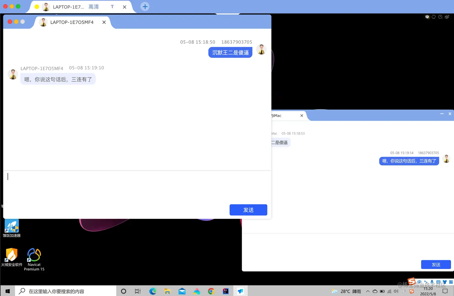 以前用 TeamViewer 的时候,还需要登录下 QQ 或者微信,毕竟有些事情还是需要沟通的,很麻烦。现在好了,ToDesk 提供了即时通信,点击远程控制画面 -> 顶部菜单 -> 对话就可以打开了。