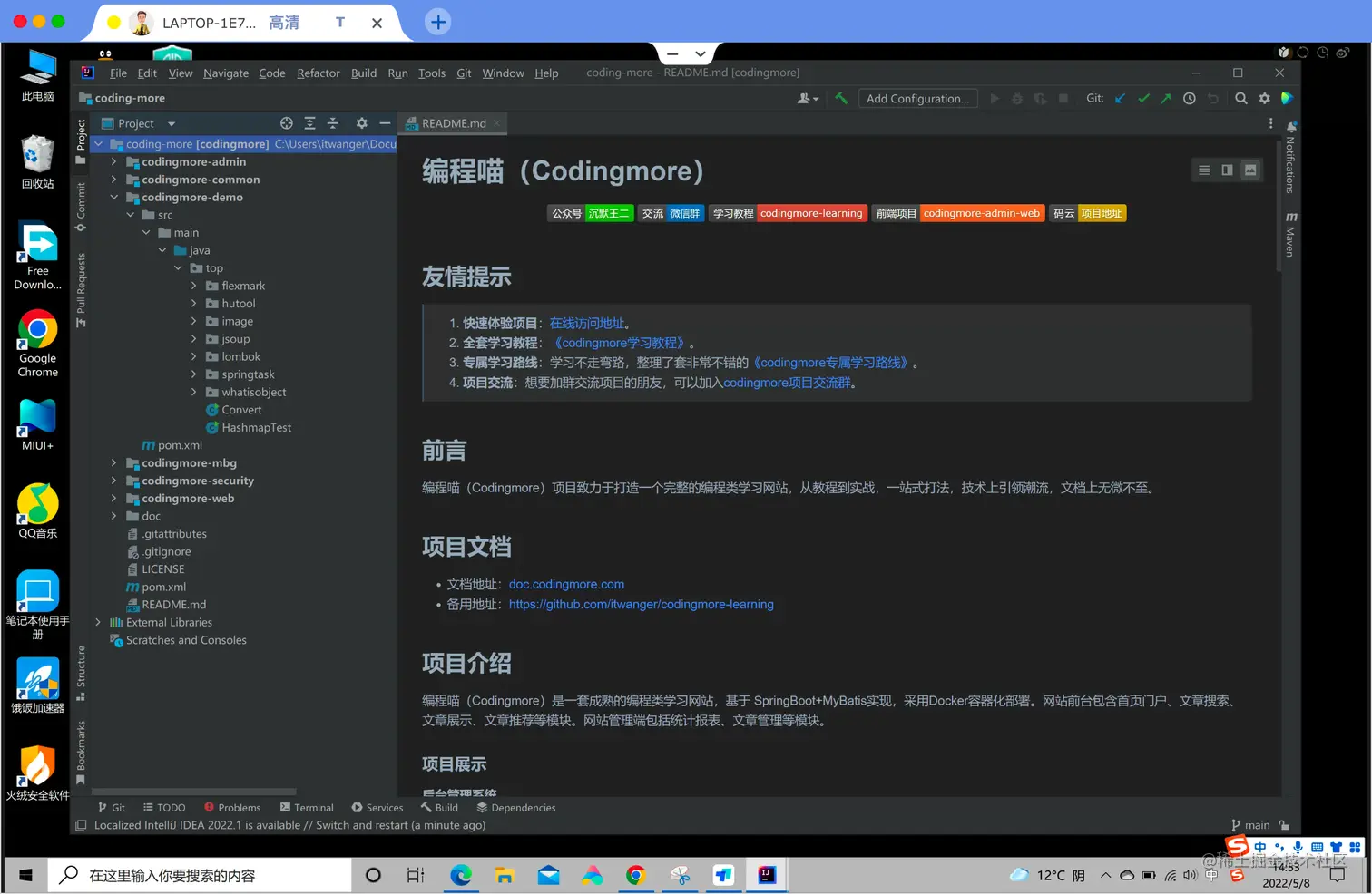打开 Intellij IDEA 运行下编程喵开源项目,感觉还算丝滑,鼠标和键盘的延迟感不是特别明显。