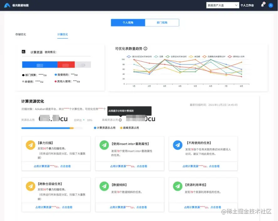 计算域内主要收集的是和计算过程相关的数据,比如SQL脚本、Jar包程序的执行,在这个主题域中可以查看到和计算相关任何明细信息,例如,某个表读写的SQL、SQL的执行耗时、CPU/内存消耗明细、读写的分区和字段信息、底层的计算引擎、存在数据倾斜的stage、IO读写的时长等相关信息。
