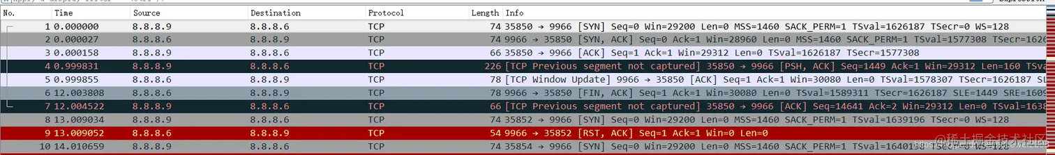 通过抓包结果,可以看到TCP的三次握手已经完成。传送数据在client端可以看到,server端未收到数据。Send_Q越来越大,也可以判断,数据在clinet端系统,未发出。Send_Q越来越大可以判断消息都堆积在本机,服务端抓包,未收到传数据这个包。证明只有传数据库的包被拦截。比较抓包文件中,数据包和tcp三次握手的数据包区别。
