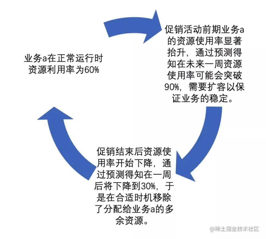 在传统的容量规划中,为了降低容量决策的风险通常会提供一定的冗余容量,而这会降低资源使用效率,增加企业的经营成本。另一方面,人工手动方式进行容量规划效率低,且强烈依赖于人工的经验,难以做到定量标准化。通过对业务机器资源使用情况的分析,结合预测算法对资源利用率的预测结果,能够在保证不影响业务稳定运行的情况下,弹性对分配的机器资源进行扩/缩容,以最大化机器资源使用率,降低运营成本。