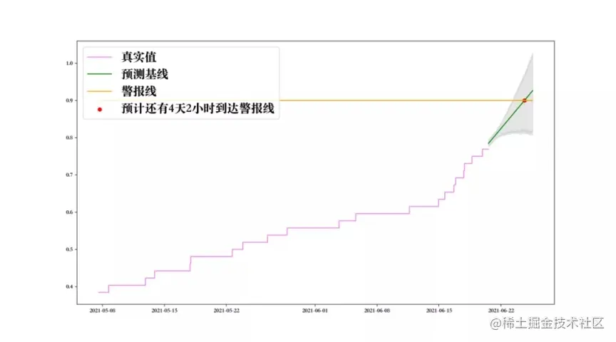 算法可以学习磁盘使用率历史数据的增长情况,对未来一段时间的磁盘使用率进行预测,一旦发现在临近的某个时间点(比如四天后)磁盘使用率将超过警报线时,就能提前一周通过预警告诉运维人员四天后磁盘将满,这将给运维人员足够的时间进行动态扩容,以避免出现资源匮乏而引发损失的问题,最终避免运维故障的发生。