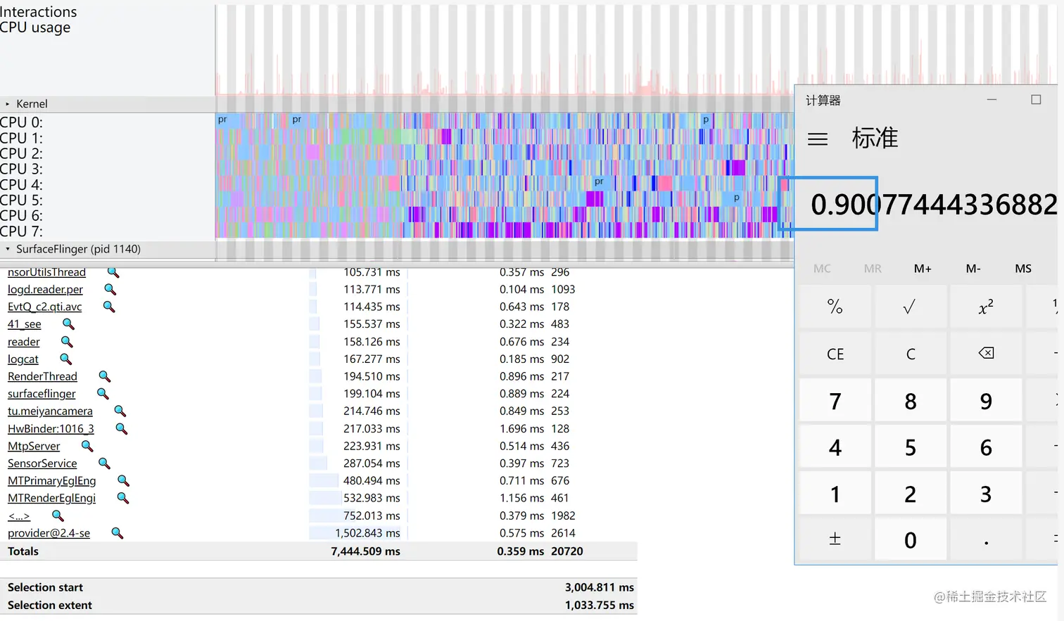 从trace 中看,app 取帧后由于美颜相机app的一些原因,导致没法及时处理帧,并queuebuffer 给SF,进而导致丢帧卡顿。查看此时美颜相机MTRenderEglEngi 渲染引擎一直在不停的Running 状态,同时查看CPU loading 为90%。