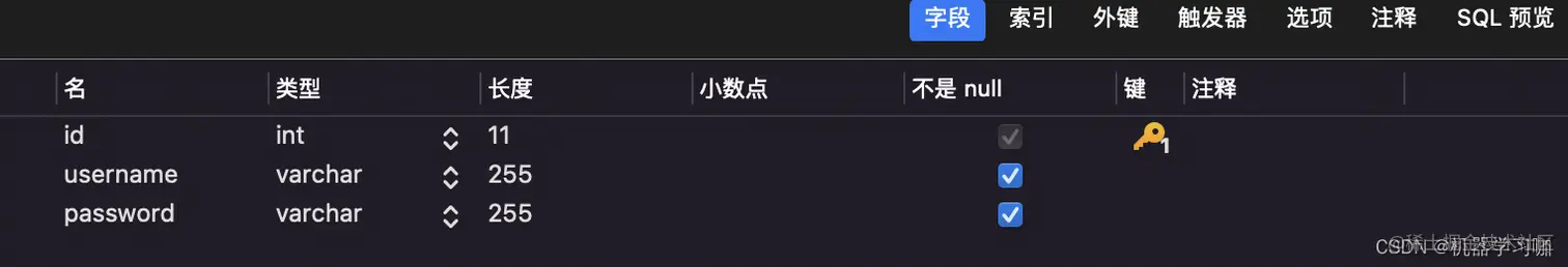 - step3:设计表,新增id、username、password字段,如下。