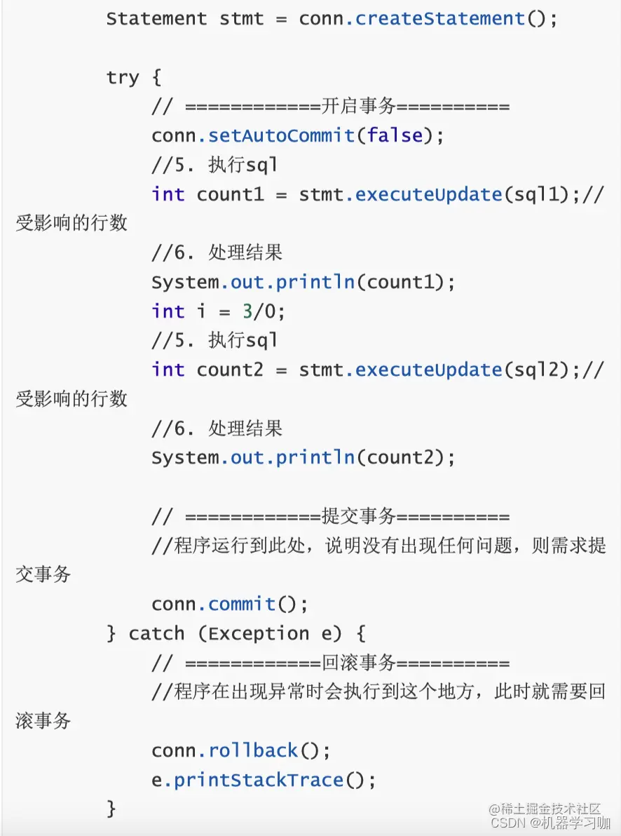 我们需要通过设置自动提交为false,来手动开启事务。具体使用上述代码已写的很清楚。