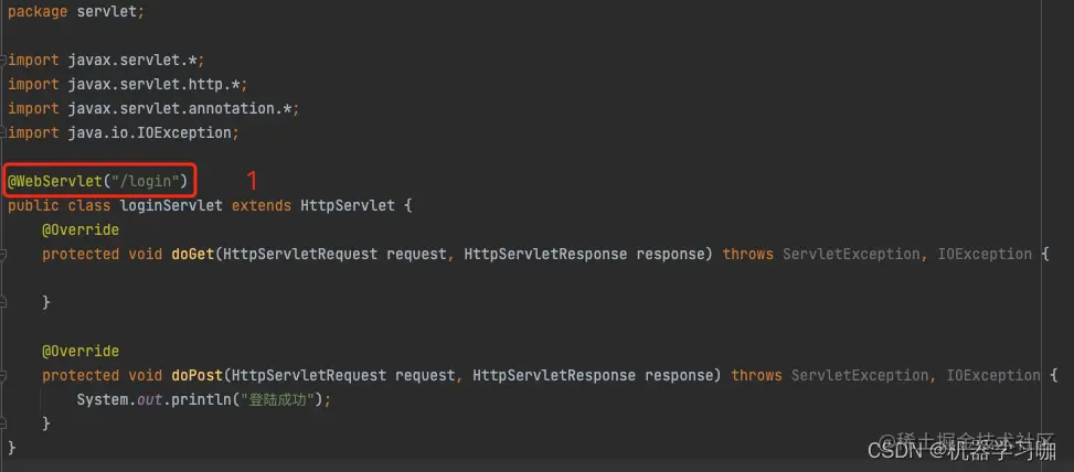 新建好的文件基本就长这个样子,1的位置需要自己写,里面的路径是访问的路径。通过post或get访问这条路径会触发响应的doPost和doGet函数。