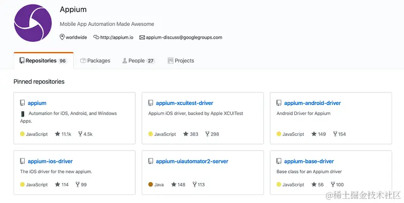 Appium 是由多个子项目构成的,github 访问如下图:\