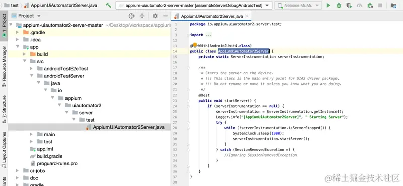 Appium 底层执行 Android 测试真正的工作引擎是一个 JAVA 项目 appium-uiautomator2-server。可以将这个项目克隆到本地,使用 Android Studio 工具或者其它的 JAVA 项目 IDE 工具打开这个项目。