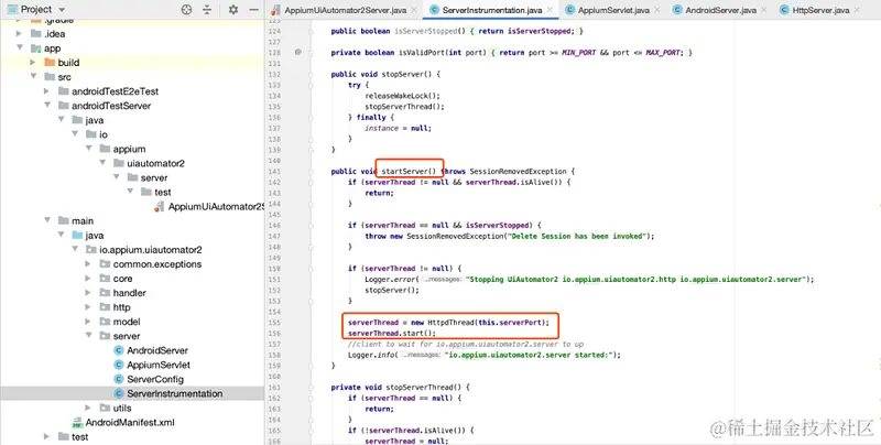 startServer( ) 方法就是它的启动入口函数。这个函数里面调用了 ServerInstrumentation 类里面的 startServer( ) 方法。如下图:\