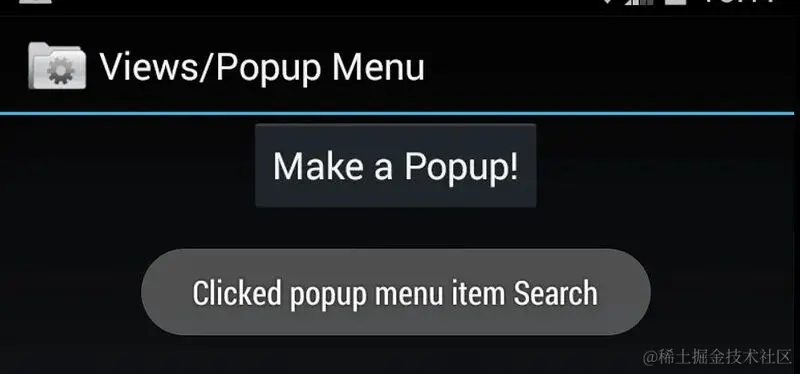 在模拟器中打开 API Demos 应用,依次点击 “Views”-“Popup Menu”-“Make a Popup”-“Search”,查看页面 Toast 元素。