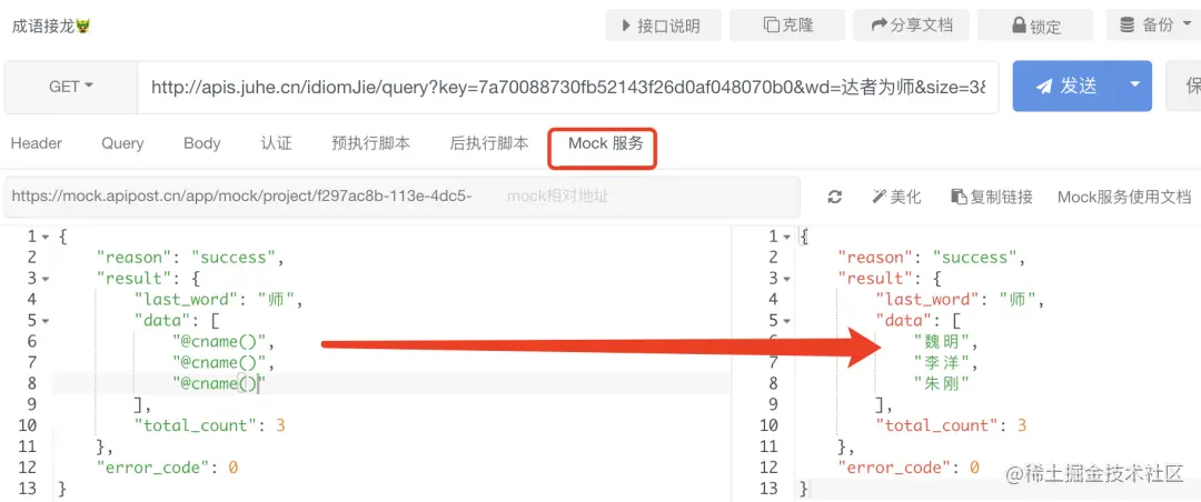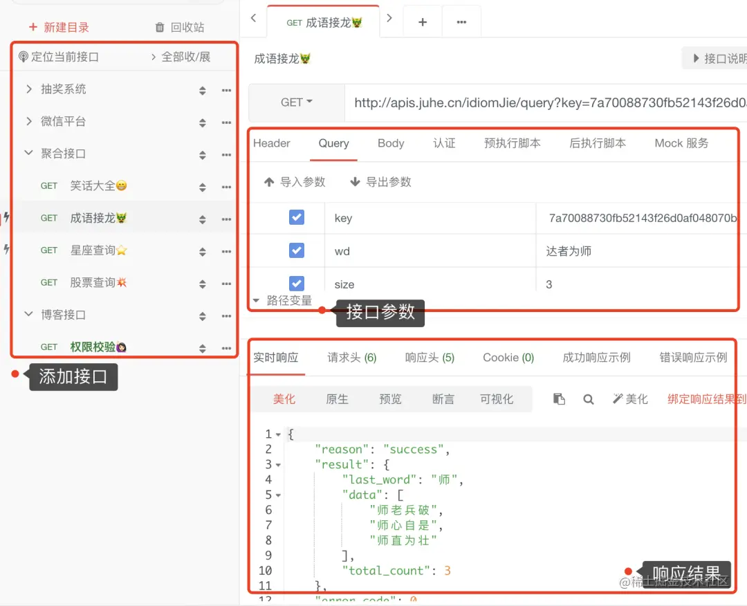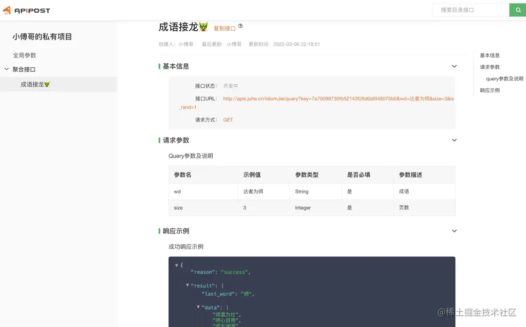 - 描述:小傅哥除了使用 ApiPost 做些项目上的使用,也加了一些自己喜欢玩的 API,例如:成语接龙,自从加了这个 API 我成语接龙就没输过 哈哈哈 😂