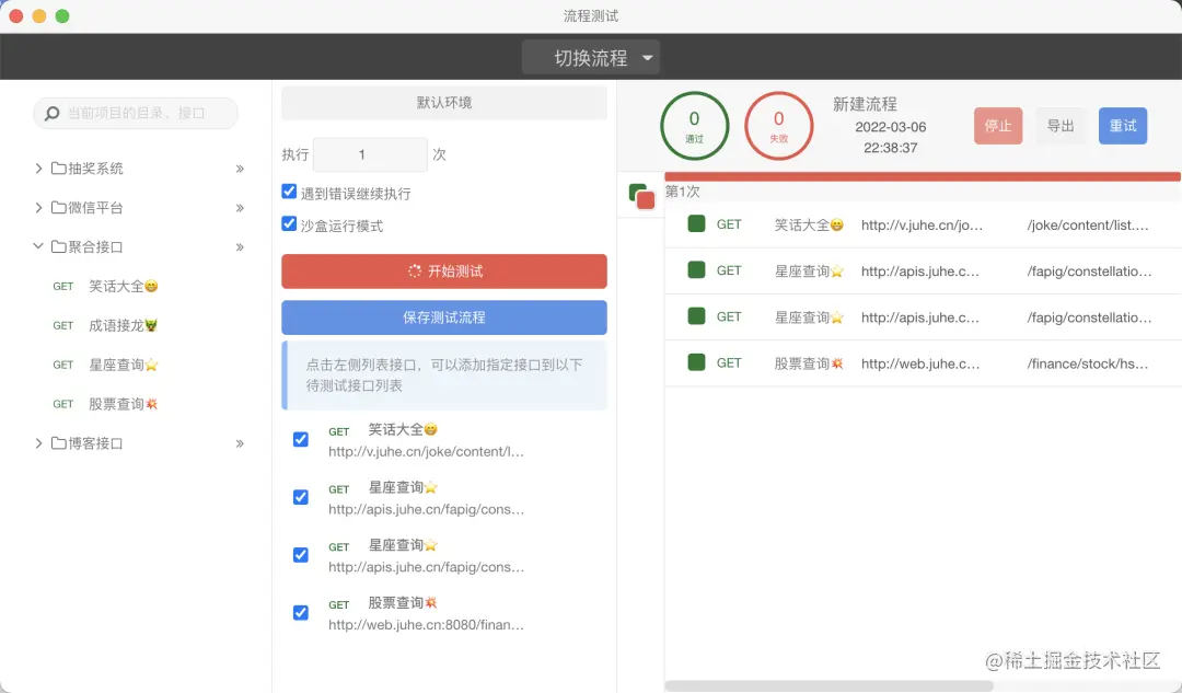 流程测试是 ApiPost 所提供的一个接口结合测试功能,作为一个完整调用链路的方式进行访问接口,这个时候你可以做一些冒烟测试,对于测试同学来说,是一个非常赞的功能。