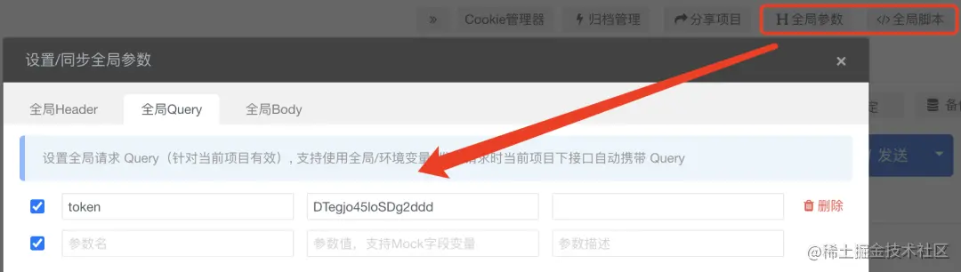 - 还支持全局的 Query 以及 Body,可以把一些不变的请求参数都配置好全局参数,这样会让我们编写接口请求时,非常节省时间。