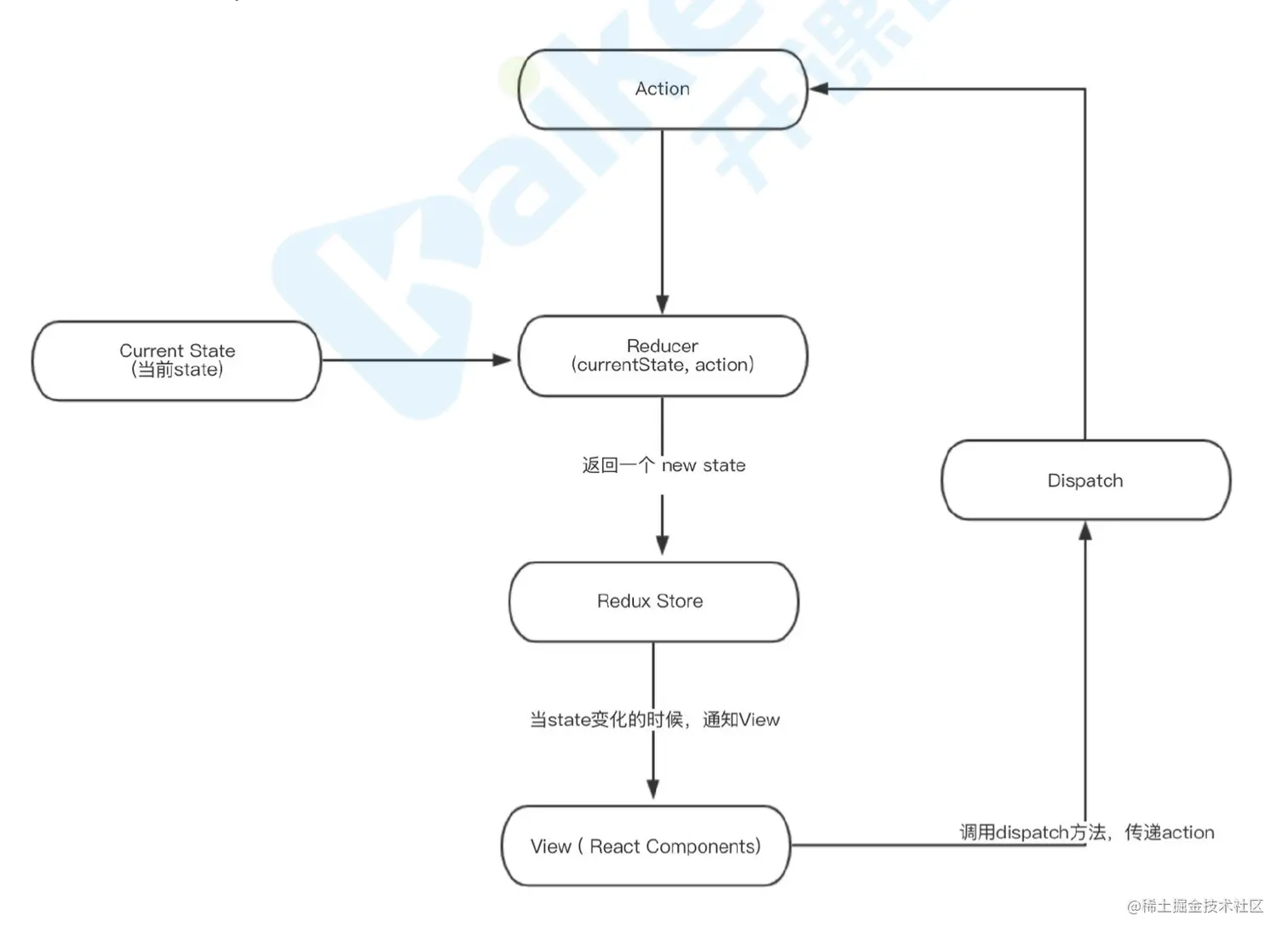 4. action 提交到 reducer 函数⾥,根据传入的 action 的 type,返回新的state