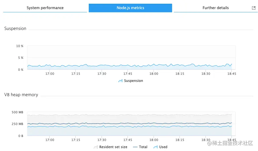 随后的页面将显示所选任何给定指标的平均利用率。 单击单个 pod 将进入其进程详细信息页面,其中可以查看有关 cpu/内存利用率和重新启动时间的信息。 对于 SSR,有关 CPU 的详细信息将在系统性能选项卡下,而有关 V8 内存使用的详细信息将在 Node.js 指标选项卡下。