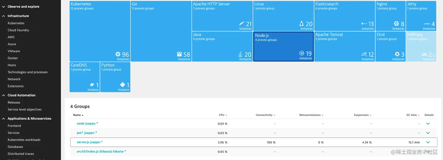 此外,SAP CCV2 上的 SSR 容器是运行 Node.js 代码的地方,因此更容易受到性能下降的影响。在选择 Node.js 和 server.js jsapps-* 之后,可以从 Dynatrace 中的技术和进程页面查看 CPU 和内存。注意 SSR 应用文件的名称可能不同,默认为 main.js.