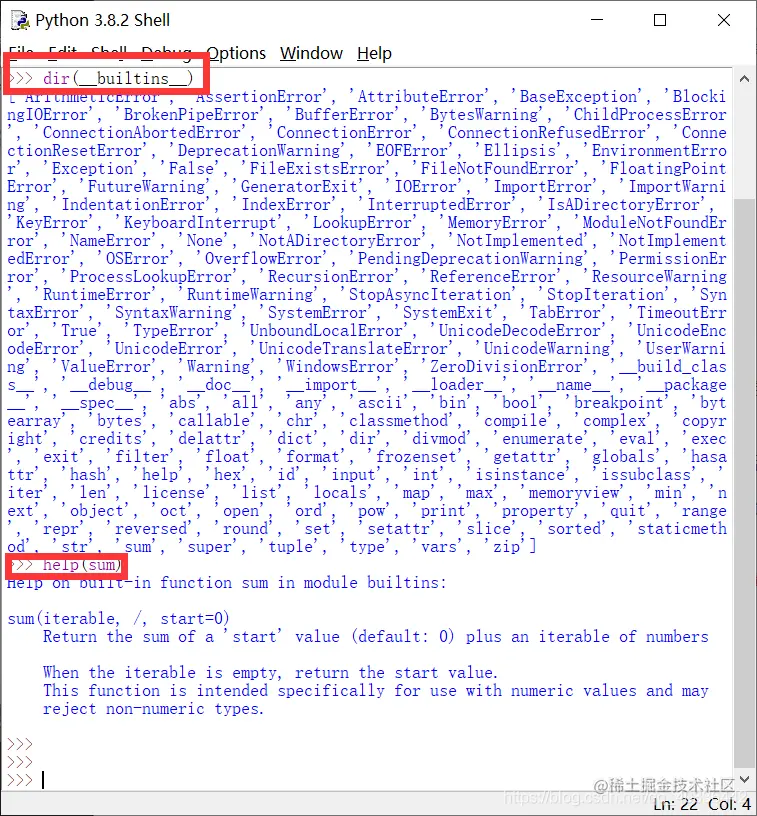 输入dir(builtins)命令可以查看所有的内置函数,注意括号中前后都是两个下划线,可以用help(input)命令来查看每个内置函数的功能描述