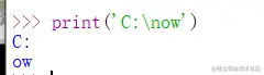 但是反斜杠有时候也会产生歧义,如在路径中’C:\now',进行打印,如下图,会导致换行的产生: