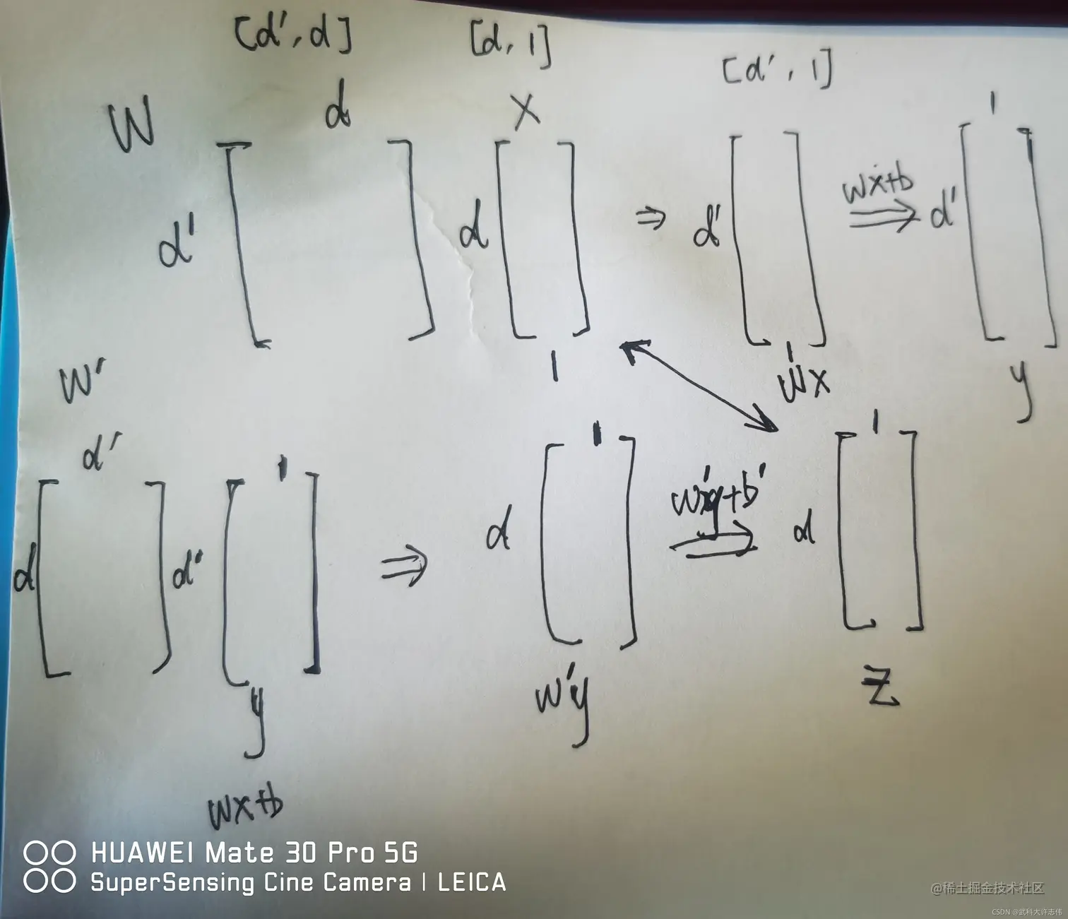 同样 y 也可以通过一个权重W’和一个偏置向量b'而被重新映射为重构矩阵z shape=[d,1] ,权重W' shape=[d,d'] 加上一个shape=[d, 1]的bias b'