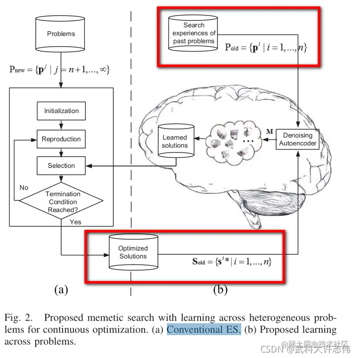 - 在本文中,我们通过对模因搜索进行研究,通过学习跨异构问题进行持续优化,为模因计算做出贡献。 与现有的模因计算工作相比,在当前提出的范式中,模因已被定义为有用的知识,这些知识被捕获和重用,以增强跨连续优化问题的进化搜索过程,这些问题可能在问题维度、目标数量等方面有所不同, 并且不能通过第 I 部分中提到的方法处理。 此外,如图 2 所示,就像人类大脑中用于应对日常生活和解决问题的知识一样,DA 学习到的知识模因驻留在 ES 的人工大脑中,扮演着积极偏向搜索的角色新遇到的问题。 建议的自动编码模因搜索的细节将在下一节中介绍。