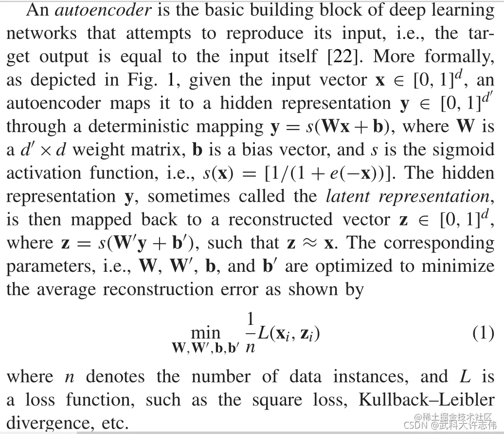 - DA是DNN的基本组成部分,Anautoencoderis the basic building block of deep learning networks that attempts to reproduce its input, i.e., the target output is equal to the input itself [22].
