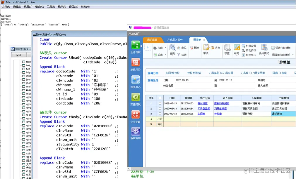 成功从VFP传送了一张单据到用友系统中。