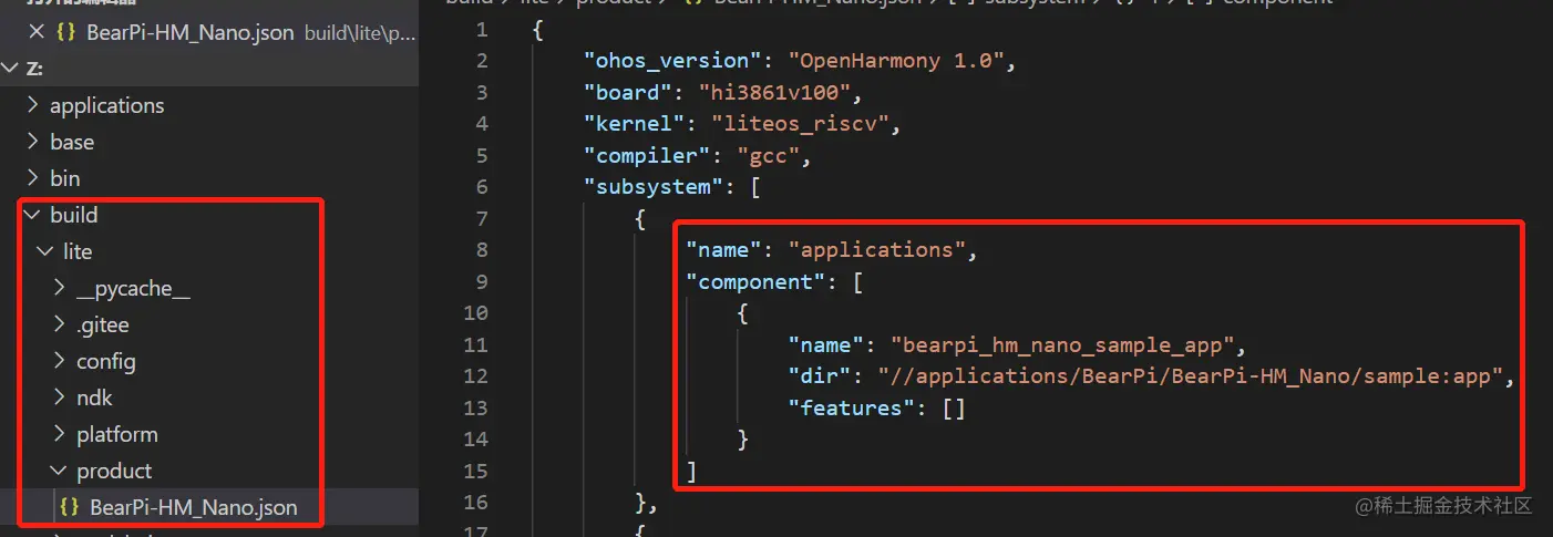 编译的时候使用到了 json 文件 BearPi-HM_Nano.json ,位于 bulid/lite/product 中,该文件描述了一些编译模块的路径。